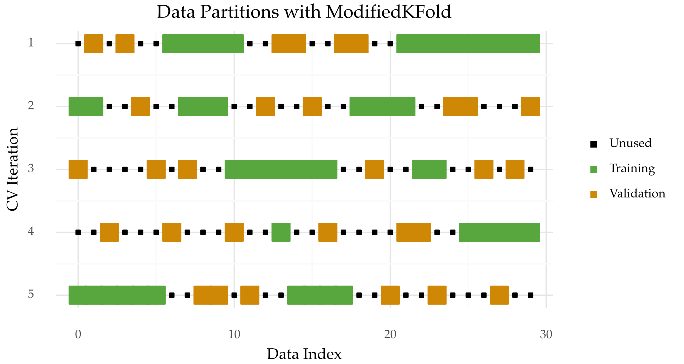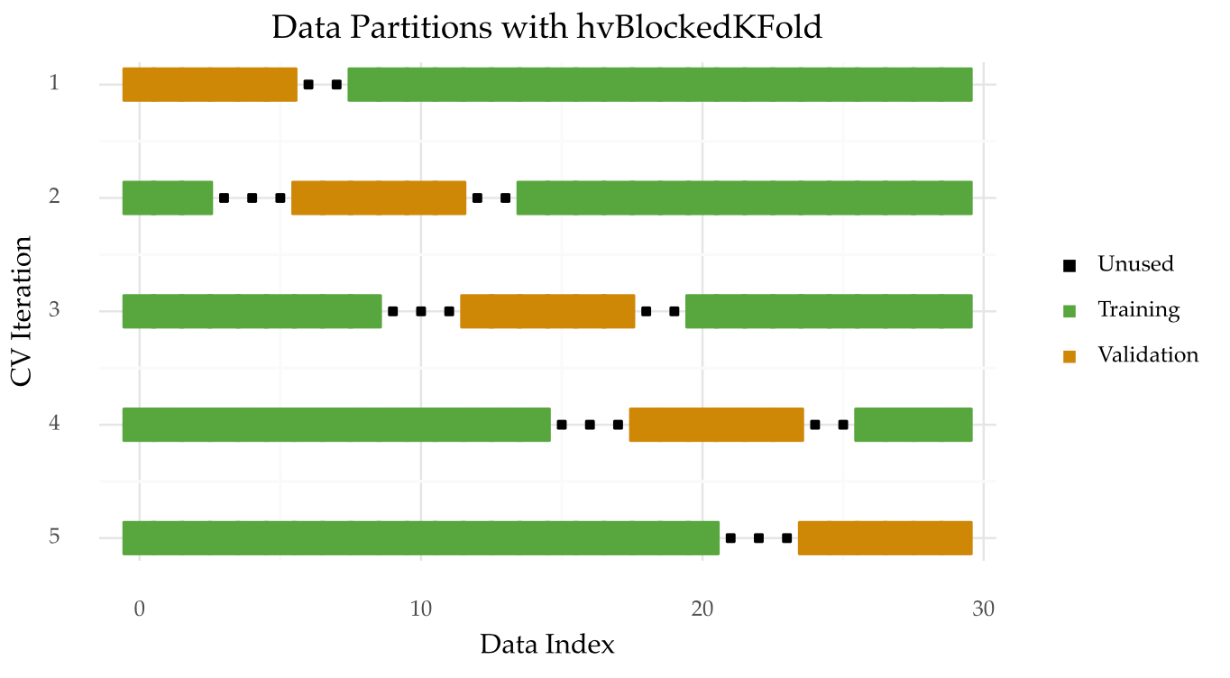 8. hv-블럭 K-폴드 교차검증 : 블럭 K-폴드 교차검증과 동일하지만, 훈련세트와 평가세트 사이에 간격을 두어 독립성을 확보하는 것이 차이입니다.